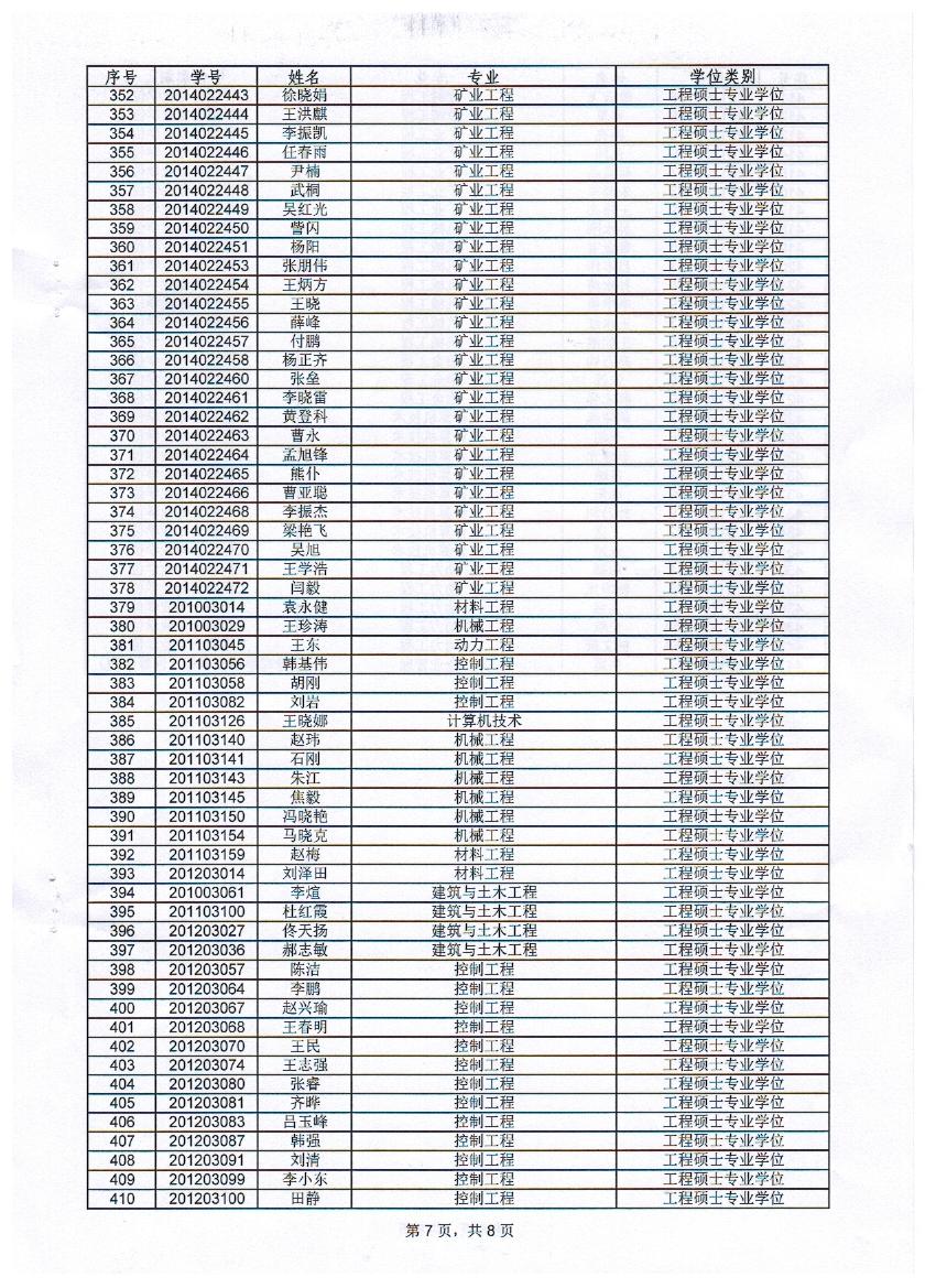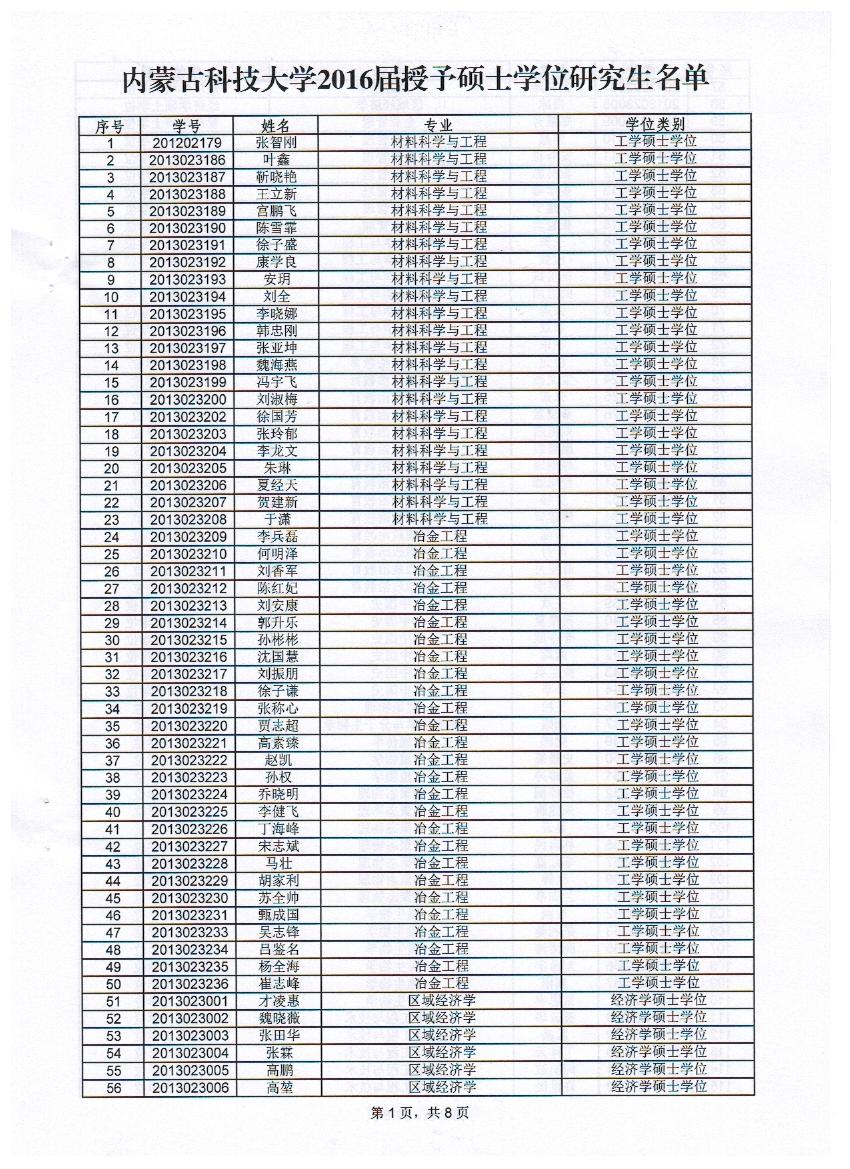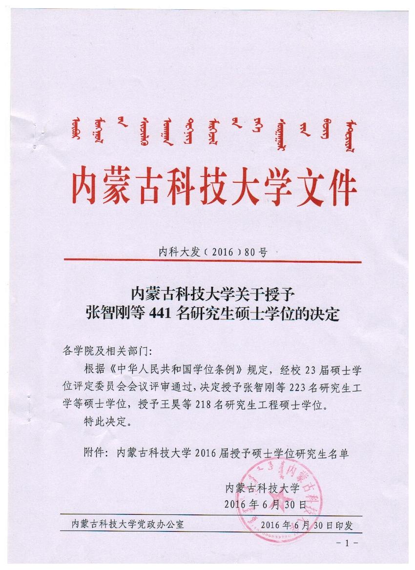 内蒙古科技大学关于授予张智刚等441名研究生硕士学位的决定