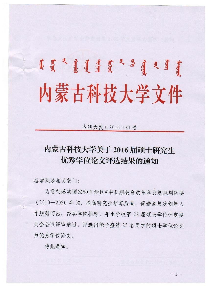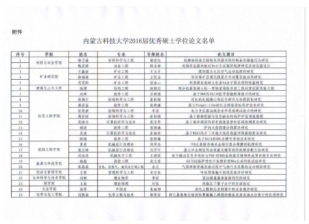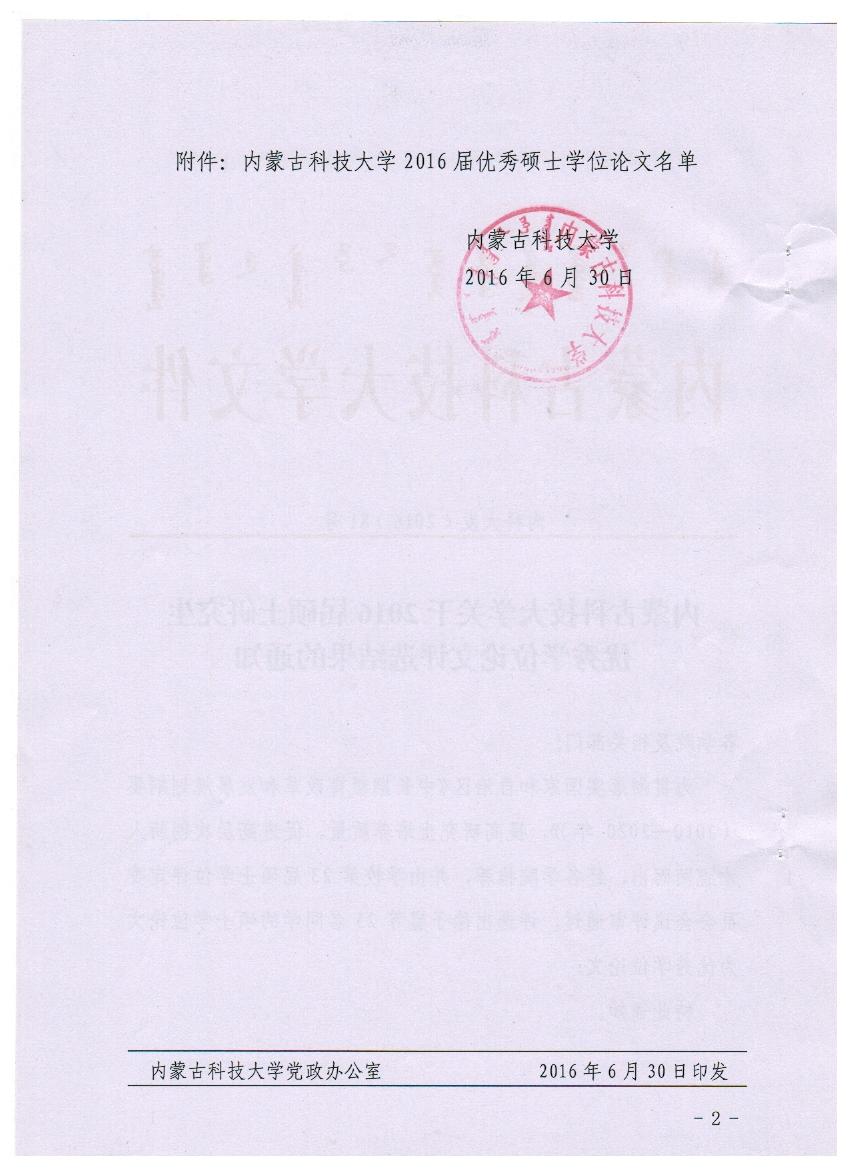 内蒙古科技大学关于2016届硕士研究生优秀学位论文评选结果的通知