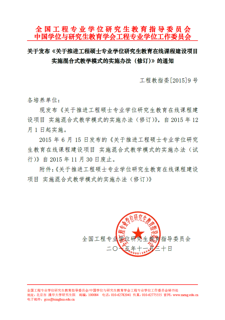 关于发布《关于推进工程硕士专业学位研究生教育在线课程建设项目实施混合式教学模式的实施办法(修订)》的通知