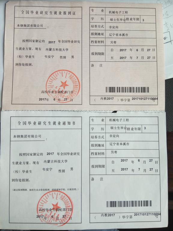 2、就业协议书:作为应届毕业生最主要的就业证明材料,由学校统一发放,每人一份一号(正面左上角的编号),每一份协议书四张。