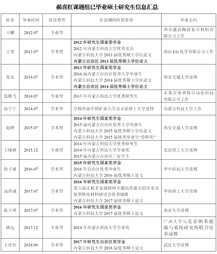 2011年8月――现在内蒙古科技大学材料与冶金学院无机非金属材料专业从事教学与科研工作,2011年晋升为教授;